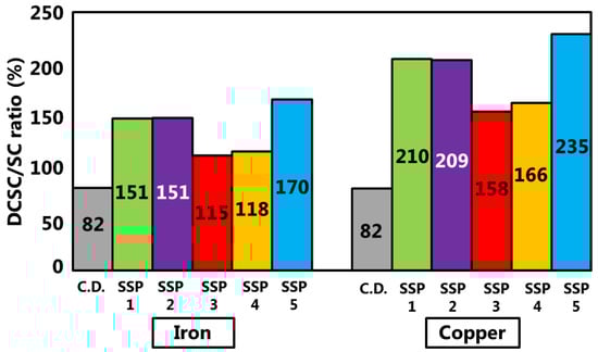 Figure 5 shows the DCSC values of iron and copper by future scenario, as calculated from Equation (3). In Figure 5, each value is expressed relative to SC (hereinafter referred to as the DCSC/SC ratio) of each metal based on the constant case.