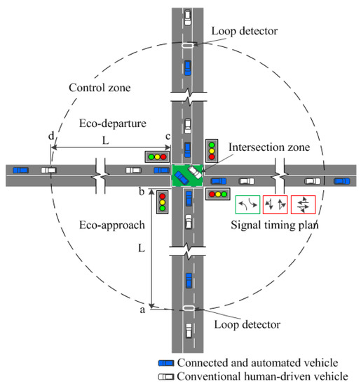 - Zohdy, I.A.; Rakha, H.A. Intersection management via vehicle connectivity: The intersection cooperative adaptive cruise control system concept. J. Intell. Transp. Syst. 2016, 20, 17–32. [Google Scholar] [CrossRef]