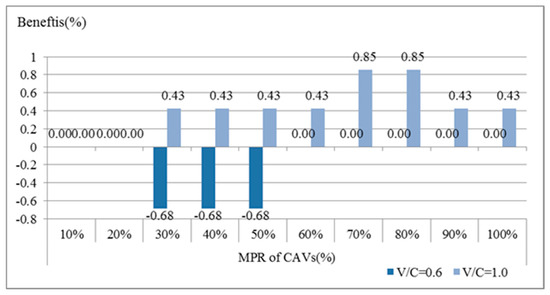 Figure 6 shows the fuel consumption benefits under various levels of CL and MPR of CAVs. The proposed system generates significant benefits on fuel efficiency as long as CAV is introduced. The benefits show a growing trend as the MPR of CAVs increases under these two different congestion levels. This growing trend levels off at 50% MPR of CAVs. Moreover, the benefit under saturated condition is higher than under non-saturated condition at the same MPR level. The proposed system can effectively improve the fuel efficiency.