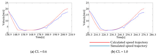 where represents the minimum speed limit of connected and automated vehicles, R and G are the duration of red phase and the duration of green phase, n is a positive value. As the results in previous studies, some vehicles spent time more than one cycle of traffic signal to travel from the loop detector to the stop bar [35]. To ensure each CAV could obtain an available optimal speed trajectory from the offline speed trajectory dataset, the parameter n should be not less than 2. Thus, the approach or departure distance L is set to the nearest hundreds to simplify the setup, as shown in Table 2.