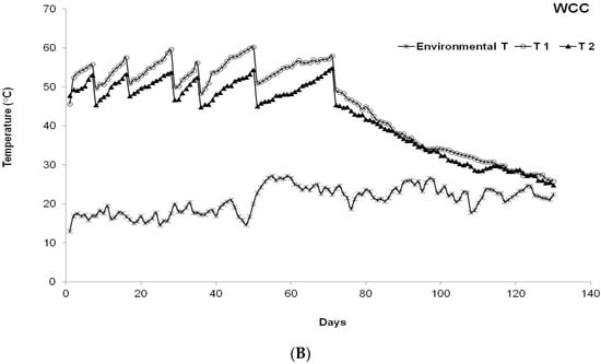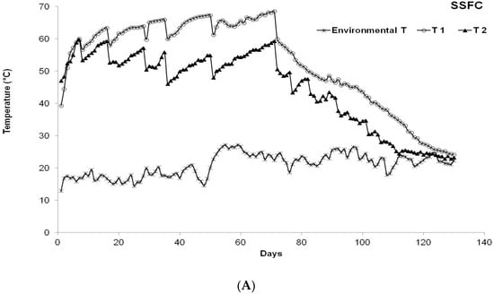 Two different composts were produced from the same SF obtained from a screw press separator. The pig slurry SF compost (SSFC) was obtained by composting 6000 kg of pig SF, while the wood chip compost (WCC) was produced after composting 8000 kg of the same pig slurry SF with 2400 kg of wood chips processed from urban garden pruning residues. Following literature recommendations [,], before undergoing composting, the wood chips were ground in a hammer mill with a screen size of 4 mm. During WCC windrow preparation, materials were thoroughly mixed to achieve a theoretical C/N ratio equal to 30, so as to optimise the composting performance []. After the set-up, windrows were placed on a concrete floor and the process was monitored for 130 days. The temperature of each SF windrow was continuously recorded with three sets of thermocouple sensors (Type K) connected to a multi-channel acquisition system (Grant, mod. SQ 1600). Each set consisted of two thermocouples placed at depths of 0.2 m (T1) and 0.6 m (T2) from the windrow surface and a third one for the ambient temperature. The temperatures were continuously monitored and recorded (Figure 1).