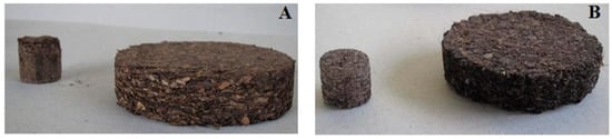 Densified samples of WCC—Wood Chips Compost (A) and SSFC—Slurry Solid Fraction Compost (B) obtained by applying pressures in the range of 5.0–7.0 MPa.