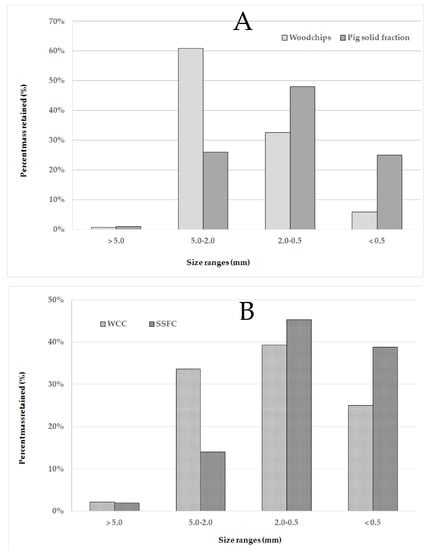 Particle size distribution of the raw materials—pig slurry solid fraction and wood chips—(A) and the final composts—SSFC and WCC—(B).