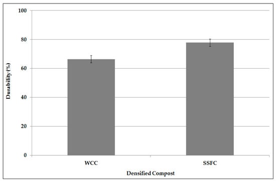 The results of the durability test performed with the manufactured compacts showed (Figure 6) that SSFC was characterized by durability values significantly (p < 0.05) higher than WCC. In particular, the average compact durability was 66.5% and 77.9% for WCC and SSFC, respectively.