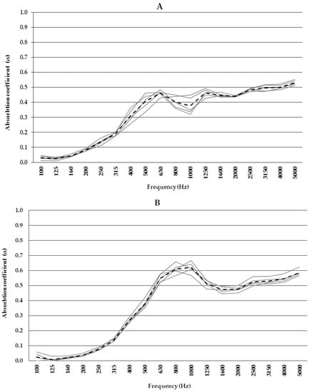 According to ISO 10534-2 [], sound absorption measurements were performed using the transfer function method. This method allows one to readily obtain measurements of normal incidence parameters using small samples that are easy to assemble and disassemble. Moreover, from knowing the normal incidence properties, it is also possible to apply some corrective formulas to obtain an approximate value of the random incidence absorption coefficient.