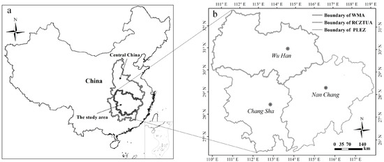 Location of study area: (a) relative location in China; and (b) urban agglomeration of the middle reaches of the Yangtze River (WMA: Wuhan Metropolitan Area; RCZTUA: Chang-Zhu-Tan Urban Agglomeration; PLEZ: Poyang Lake Eco-economic Zone).