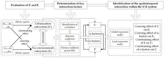 The coordinated development between urbanized development and eco-environment protection is an important issue to be solved in China’s new-type urbanization. Identifying and quantifying the impact of U on the E system as well as the reversed relationship is key to solving this issue. Based on the traditional research, which mainly focused on the impact of U on E, we proposed a quantitative analysis framework that takes into account the bidirectional interacting mechanism for investigating the influence from U to E and the constraint from E to U. After the comprehensive evaluation of U level and E quality as well as the identification of the key interacting factors in these two subsystems, this framework detects the coercion from U level and its key factors to E as well as the constraint from the quality of E and its key factors to U based on global regression (OLS here). Further, the framework employs local regression (GWR here) to examine the regional differences of the four types of relationships.