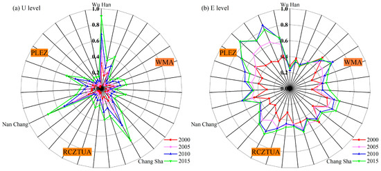 Using the index system of the U subsystem (Table 1) and entropy method, we obtained the composite score of U for each city (Figure 3a). From the temporal change, U levels of most cities increased during the study period, with a slight growth in the first five years before rising considerably from 2005 to 2015. In terms of the spatial distribution, the regional differences of U levels were remarkable. In particular, U levels in the central cites of the three city groups in the UAMRYR, namely, Wuhan, Changsha, and Nanchang, were significantly higher than other cities in their own groups, forming a significant spatial pattern of the three pillars. In addition, WMA had the highest overall urbanization level at the regional scale. To explore the spatial characteristics of U level over the 4 years (2000, 2005, 2010 and 2015), global Moran’s I was calculated using a first-order rook neighborhood contiguity matrix (in GeoDa software). The global Moran’s I of the municipal-level U values and the corresponding p values were found to be 0.012 (0.674), −0.127 (0.381), −0.143 (0.306), −0.147 (0.289), respectively, indicating an insignificant spatial autocorrelation.