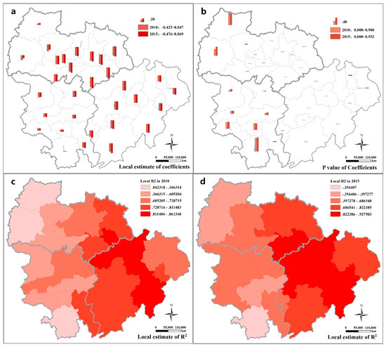 Spatiotemporal variation of the parameters estimated from the geographically weighted regression model of urbanization levels: (a) local estimates; (b) p values; (c) local R2 in 2010; and (d) local R2 in 2015.