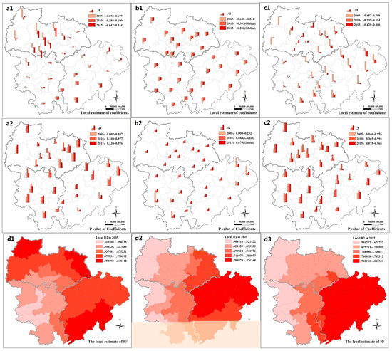 It is noticeable that the effects of the U-factors on E varied across space according to Figure 5a1,b1,c1. Further significance of the local estimates was examined using the pseudo t test (Figure 5a2,b2,c2). The explanatory power from 2005 to 2015 was spatially non-stationary (Figure 5d1,d2,d3). Next, we analyzed in detail the spatiotemporal variation of the effect of each factor on E.