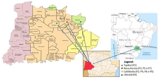 Samples were collected in the Western region of the State of Paraná in Brazil, which is a fish production pole in ground-excavated ponds for intensive cultivation of Nile Tilapia. The sampling period was from June to October of 2016, in nine areas belonging to an integrated production system located in the municipalities of Tupãssi, Nova Aurora, Cafelândia, and Ubiratã (Figure 1), where twelve ponds were evaluated.