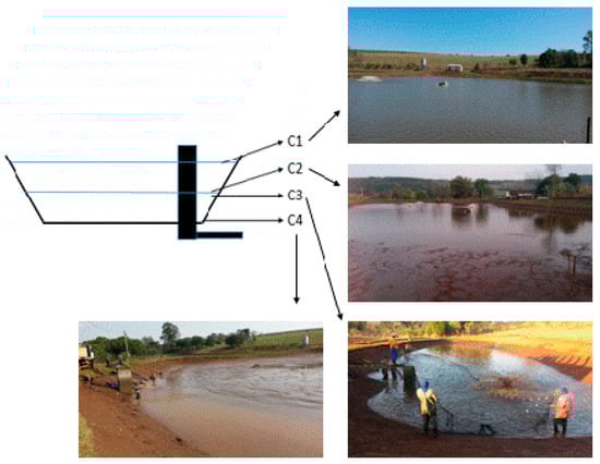 Effluent samples were collected at different times during the fish removal process, defined as “scenarios” within the same pond. Different collection times were, therefore, considered as replicate samples within the same site. These scenarios were characterized as C1: Full; C2: Medium; C3: Net; and C4: Final (Figure 2). The term “Full” represents the initial time in the fish removal process, before any intervention or collection of water was conducted, and before the beginning of water drainage; the term “Medium” represents the time when approximately 60% of the pond water was drained, however, without any intervention on the environment; the term “Net” represents the time after the first net trawling for fish harvesting was executed. In this time the revolving of sediment possibly occurs, resulting in suspension of organic matter and alteration in the water’s physical and chemical composition; and the term “Final” represents the final drainage time, when there is approximately only 5% of effluent in the pond.