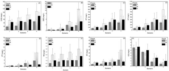 The COD/BOD ratio is related to the degree of effluent degradability. When this ratio is <3.5, the biodegradable fraction is high, when it is >3.5, the inert fraction is predominant [21]. Therefore, the greater the biodegradable fraction, the easier the biological decomposition. However, when the inert fraction is elevated, the physical and chemical treatment of the effluent becomes necessary to reduce the BOD and COD in the discharged effluent. Moreover, the biological degradation of organic matter by decomposing bacteria depends on several factors including temperature, dissolved oxygen available at the bottom of the tank, pH, and alkalinity, which is necessary for bacterial survival. Thus, it can be observed that in the C1 scenario, independent of pond sizes, the COD/BOD ratios were <3.0, indicating that the present organic matter is biodegradable, and can be easily degraded by decomposing bacteria [21]. However, as the process of fish removal goes on from the C1 to C4 scenarios, the COD/BOD ratio increased, indicating that the organic matter fraction becomes less biodegradable at the end of the process, making it’s biological decomposition increasingly difficult.