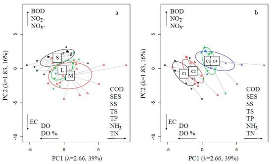 Scores of the main components 1 (PC1) and 2 (PC2) obtained in relation to pond sizes (a) and sampling scenarios (b). Eigen values (λ) followed by percentages of explanation are presented close to the axes. Arrows indicate the relationship between PCs and variables: BOD: biochemical oxygen demand; COD: chemical oxygen demand; NO3−: nitrate; NO2−: nitrite; SES: sedimentable solids; SS: suspended solids; TS: total solids; TP: total phosphorus; NH3: ammoniacal nitrogen; TN: total nitrogen; DO: dissolved oxygen; DO%: percentage of dissolved oxygen saturation; and EC: electrical conductivity.