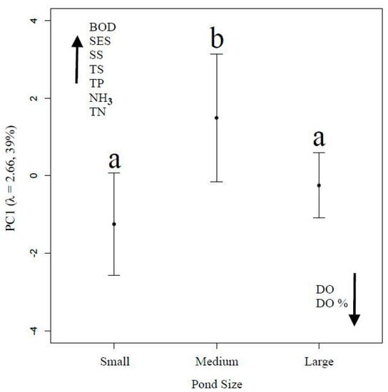 Averages and 95% confidence intervals for the first main component (PC1) relative to pond sizes. Distinct letters on confidence intervals indicate significant differences by the Tukey’s test. Arrows indicate the direction of PC relationship with variables: COD: chemical oxygen demand; SES: sedimentable solids; SS: suspended solids; TS: total solids; TP: total phosphorus; NH3: ammoniacal nitrogen; TN: total nitrogen; DO: dissolved oxygen; and DO%: percentage of dissolved oxygen saturation.
