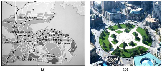 Figure 1. Geographical information of the squares in Dalian City: (a) locations and distribution of squares; and (b) a typical square (Zhongshan Square). Redrawn with modifications from Zhou [28].