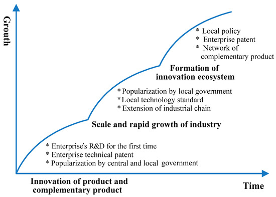 Secondly, this study deduces the symbiotic process model among communities within the CNG vehicle IE (see Figure 3). It reveals the symbiosis among the communities of CNG vehicle product enterprises, CNG complementary products enterprises, customers, and governments within the CNG vehicle IE. Its essence is to create an “ecological environment” which connects the strategies and policies of the government, product innovation of product enterprises, resource supply of complementary product enterprises, and product and complementary product demands of customers in the process of industrialization of technological achievements. This ecological environment helps to improve the system of product innovation and complementary product network. Without this vibrant ecological environment, the innovation may fall into the “valley of death” at any time.