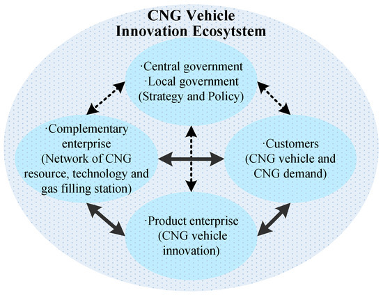 This study defined innovation ecosystem as “a network system consisting of the communities of governments, product enterprises, complementary products enterprises, and customers, which interact, communicate, or promote innovation in order to create valuable new products”. CNG vehicle innovation ecosystem is defined as a network system consisting of the communities of governments, CNG vehicle product enterprises, CNG complementary products enterprises, and customers, which interact, communicate, or promote innovation in order to create valuable new CNG vehicle products.
