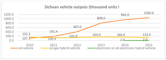 CNG vehicle IE is substitutive to other vehicle IEs. Some scholars believe that CNG vehicle IE is in transition to the counterpart of electric vehicles. This research argues that it is necessary to discuss the problem in light of local conditions. From a long-term perspective, any technology is transitional. From 2010 to 2015, the average annual share of Sichuan fuel vehicle production increased from 41.3% to 88.6%, which showed a year-by-year trend as shown in Figure 5. The average annual share of oil–gas dual fuel vehicle fell from 58.7% to 11.2%, manifesting the trend of production fluctuation as shown in Figure 6. The reasons are: