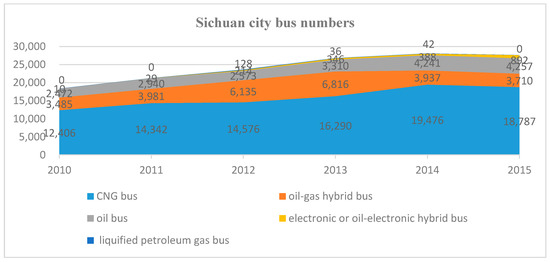 In the 2000s, the Sichuan CNG vehicle industry entered a phase of rapid extension. In 2001, Sichuan province formed a streamlined industrial production, which contained the research and production of natural gas and CNG vehicles, and the number of CNG vehicles and gas stations in the province reached 25,000 and 81, respectively [34]. In 2003, the project of the popularized application of CNG for diesel buses was approved by the Transportation Bureau of Sichuan provincial government.