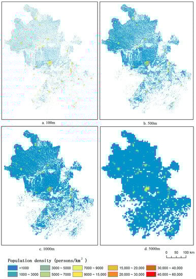 Grid population distribution of Anhui Province at 100 m, 500 m, 1000 m, and 5000 m grid, respectively.