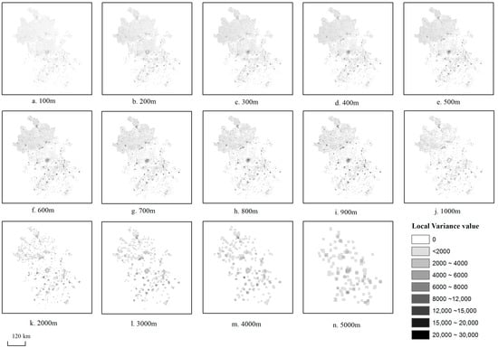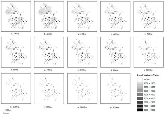 We used MATLAB R2015b to produce a series of local variance data based on multiple gridded population distribution data via the traditional ALV method, namely by keeping the moving windows’ number of rows and columns constant while the corresponding actual ground areas changed. Figure 4 displays the local variance data based on a 3 × 3 moving window. Several high-value areas are especially obvious over Hefei City under the relatively smaller grid sizes such as 200 m–900 m. The values of local average data under the other grid sizes are distributed relatively evenly.