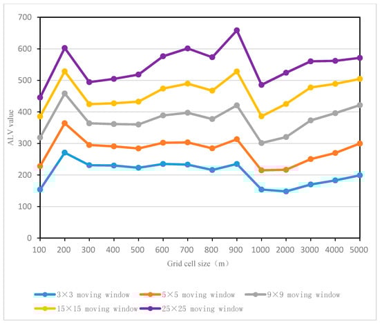 Then, we used the “Spatial Analyst tool” of ArcGIS 10.1 to calculate the ALV value of each image. We drew line graphs showing different grid sizes on the x-axis and the calculated ALV values on the y-axis. Figure 5 shows the variations in ALV values under the 14 grid sizes calculated by the traditional ALV method. When comparing the ALV values vertically, under the same grid size, increasing window sizes caused the ALV values to increase. When comparing the ALV values horizontally (namely, different grid sizes with the same window size), the values increased sharply from 100 m to 200 m and dropped from 200 m to 300 m. From 300 m to 800 m, the values fluctuated. They increased substantially from 800 m to 900 m, then decreased sharply from 900 m to 1000 m, then increased again from 1000 m to 5000 m. We identified two obvious peaks among all the values corresponding to grid sizes of 200 m and 900 m. The changes in ALV values were altogether inconsistent among the five different window sizes.