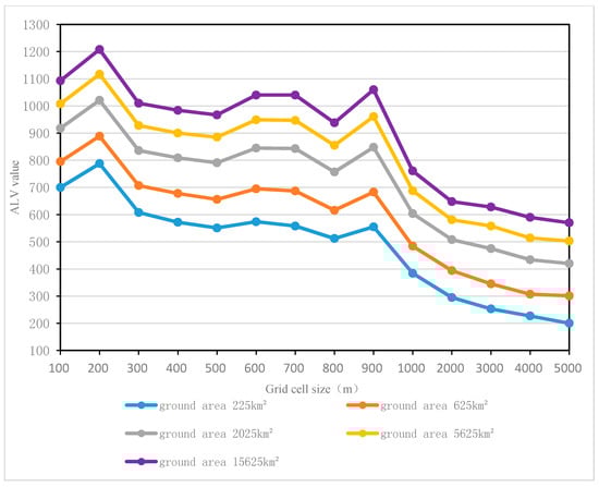 The moving windows we plugged into the ALV method, as shown in Figure 2, have the same number of rows and columns. As grid size changes, then, the actual ground area covered by the moving windows differs. The “ground area” covered by moving window here just means “the plane area”, which was beneficial to calculating, comparing, and analyzing ALV values. Table 2 displays the actual ground area change trends corresponding to multiple grid sizes.