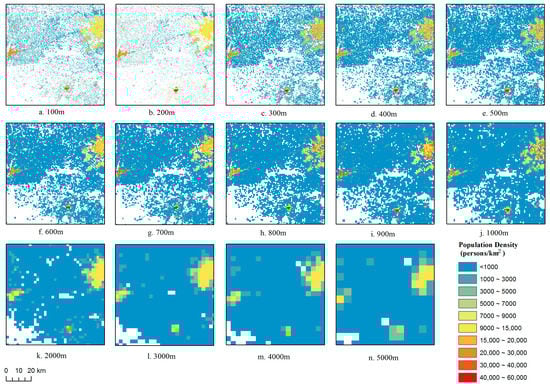 We selected a local region, covering both developed urban and remote rural regions with heterogenous population distribution characteristics, to clearly display the classification features of a series of gridded population distribution data. As shown in Figure 9, at relatively small grid size, there were more legible patch boundaries and more obvious differences between colors indicating different classifications, i.e., the population density discrepancy was expressed accurately. At larger grid sizes, the patch boundaries became illegible and the colors were more homogeneous. The population distribution patches even extending to non-residential land, i.e., the population density discrepancies were expressed inappropriately. Smaller grid sizes expressed more detailed population distribution features in general, but too small a grid size (e.g., 100 m) resulted in data redundancy which would, in practice, create problems with storage and calculation costs for further data processing.