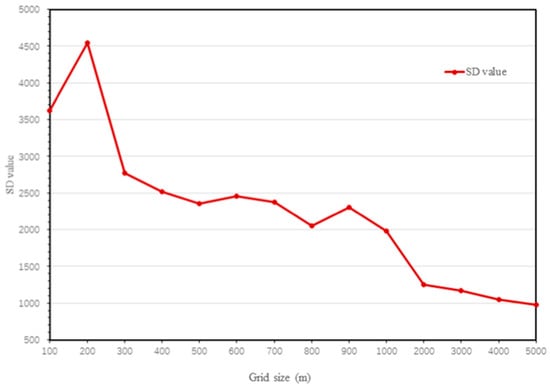 The SD values of 14 multiple-size gridded population distribution datasets were calculated in ArcGIS. We found that SD increased sharply from 100 m to 200 m, decreased quickly from 200 m to 300 m, fluctuated from 300 m to 800 m, slightly increased from 800 m to 900 m, decreased sharply from 900 m to 2000 m, and increased slowly before decreasing from 2000 m to 5000 m.