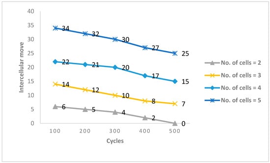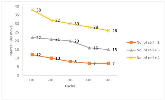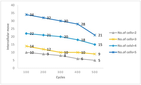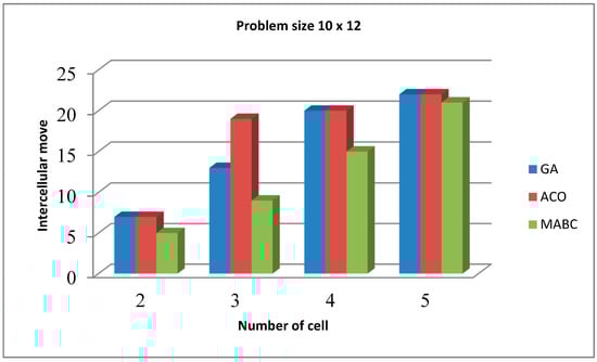 Figure 11 indicates that for cell numbers 2 and 3, MABC produces the same intercellular moves as that of GA and ACO. For cell numbers 4 and 5, MABC produces minimum intercellular moves as compared with GA.