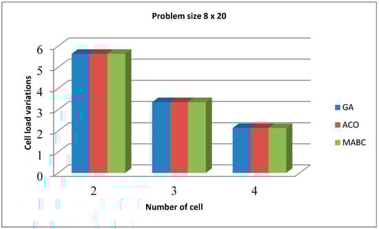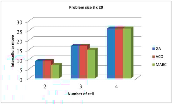 Table 4 indicates that there are 5 different matrix-sized problems and 55 cases. The cumulative intercellular moves provide better results in 41 cases out of 55 cases (75%) than that of any one of the other methods, and yields equal result in 7 cells compared to the best of the other methods. The cumulative cell load variation provides better outcome in 42 cases out of 55 cases (76%) than that of any one of the other methods, and produces equal results in 4 cells compared to the best of the other methods. Based on the analysis and results, the bar charts are plotted for clarity of results for the intercellular moves and cell load variations for the problem sizes 8 × 20, 10 × 12, and 10 × 15, to compare the results of MABC with GA and ACO.