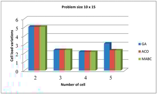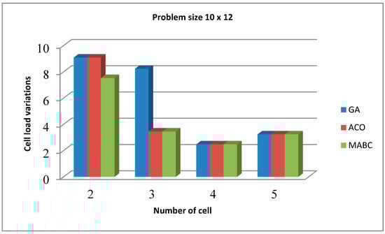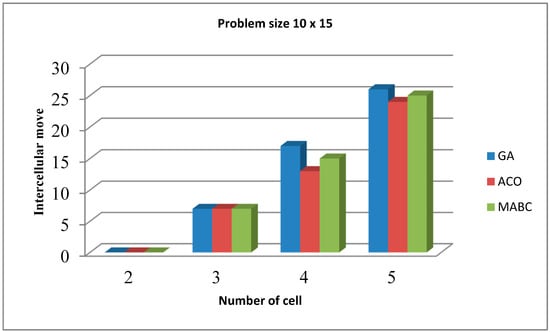 Comparison of results for minimum-sized problems, medium-sized problems, and bigger-sized problems from the literature [] are mentioned in the following tables. Table 2, Table 3 and Table 4 show the results that were obtained by the other methods in the literature using genetic algorithm (GA) [], ant colony optimization (ACO) [], results acquired by MABC, and MABC CPU time for intercellular move and cell load variations.