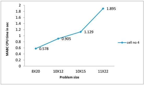 Figure 13 represents the MABC CPU time variation for cell 4 for the minimum-sized problems of sizes 8 × 20, 10 × 12, 10 × 15, and 11 × 22. The figure depicts that the increase of problem size (search space) leads to increase of CPU time.