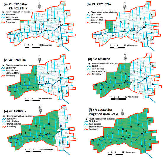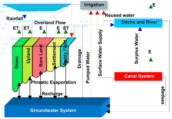 | S4–S7 | Different numbers of main-ditch command areas (canals and ditches included) | Unsaturated and saturated soil zone | Minimum of pumped water and groundwater recharge in the scale, reused water from ditches in the scale |