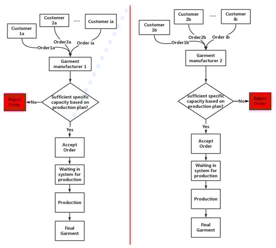 Figure 1), customers stochastically place different garment production orders to garment manufacturers. Garment manufacturers then check their recent production plan. If there is sufficient capacity (e.g., specific operators and machines) for the received order, then the manufacturer would accept it and put it into the system, waiting for production. Otherwise, the manufacturer would reject the order due to limited capacity over a short period of time.