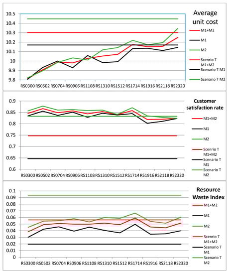Table 6. Values in green represent significant improvement, whereas values in yellow show that there was either no significant improvement or there was a significant decline. For M1, compared to scenario T, lead time and customer satisfaction indices were improved in all generated RS scenarios. The resource waste index increased in all RS scenarios due to the decrease of facility utilization as M1 is always overloaded in scenario T. For M2, the average unit cost and resource waste index were significantly improved in all generated scenarios (except RS2320), but the RS mechanism did not perform as well as M1 in terms of lead time and the customer satisfaction index. For the whole cluster, significant improvements were obtained in all scenarios (except RS2320) in terms of the four sustainable production KPIs. Therefore, the RS mechanism is really helpful for the whole industry cluster.