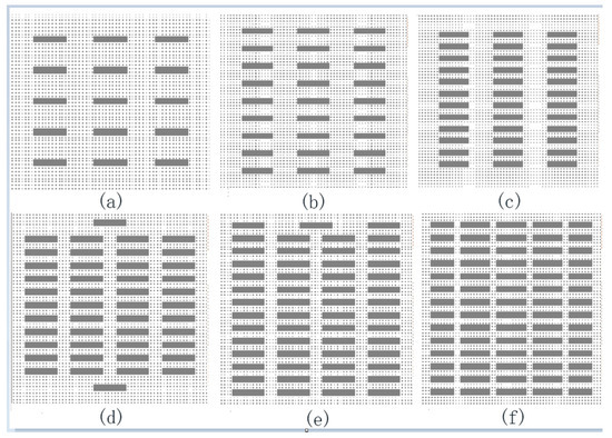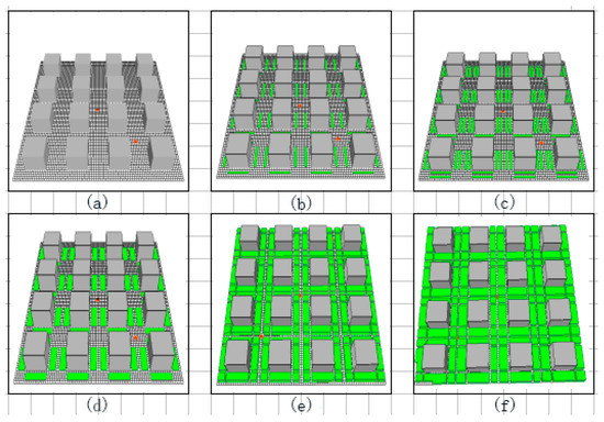 Building density cases (a) 10%; (b) 15%; (c) 20%; (d) 25%; (e) 30%; (f) 35%.