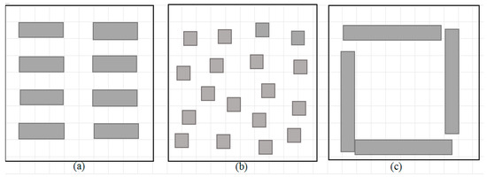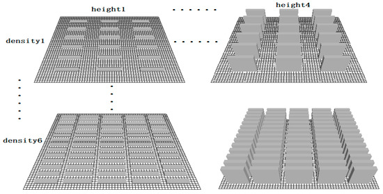 However, high-rise buildings cause considerable shadows and produce strong wind convection. Thus, the same building density with different building heights may have different effects on thermal environment in residential areas. This study analyses the influence of building height on the thermal environment of residential areas at 25% building density, 0% green ratio and the determinant building layout. Four cases of building height are simulated (i.e., 6, 20, 40 and 60 m). Different building layouts affect solar radiation and ventilation. A reasonable layout can utilize the space and make the thermal environment of residential areas considerably comfortable. The common building layouts of residential areas in Nanjing City include determinant, point group and periphery type, which are simulated with 20 m building height, 25% building density and 0% green ratio (Figure 2). Green is widely assumed to have a good cooling effect. A higher green ratio indicates better residential thermal environment conditions. To reduce the influence of green space settings on simulation results, this study adopts average allocation and mixed-type green in which the allocation ratio of tree, shrub and grass is 1:2:4. Then, six cases are simulated to analyze their effects on thermal environment within the same climate conditions (i.e., ratios 1 to 6 are 0%, 10%, 20%, 30%, 40% and 50% with 20 m building height, 25% building density and determinant building layout (Figure 3). A comprehensive simulation scheme with 24 cases is designed to discuss the comprehensive effects of building height, density, layout and green on thermal environment. Each case simulates three building layouts (i.e., determinant, point group and periphery type) and six greening ratios (i.e., 0%, 10%, 20%, 30%, 40% and 50%; Figure 4).