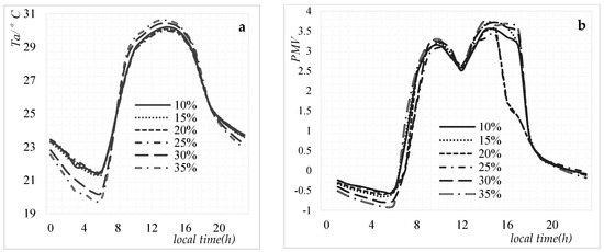 The ATa, APMV and EH initially decreased and then increased with the increase of building density. At 25% building density, ATa, APMV and EH were the lowest and CH was the highest. At 35% building density, CH was the lowest, ATa, APMV and EH were the highest. Therefore, 25% building density possessed the optimum thermal environment by comprehensively considering ATa, APMV and CH (Table 2). Large building density results in the enlargement of architectural shadow and reduction of direct solar radiation during the day, which leads to a decrease in Ta and PMV. However, extremely large building density affects the overall ventilation of the community and delays the cooling of the heat, which will lead to the increase in Ta and decrease in human comfort.