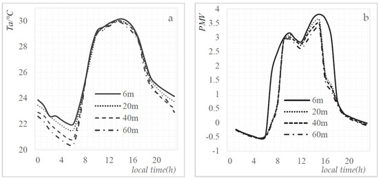 The effects of building height on thermal environment during 24 h (a) the effects on Ta, (b) the effects on PMV.