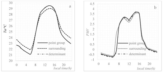 The ATa and PMV of the three layouts presented the same trend, that is, increasing slowly after 7:00 a.m., reaching maximum at 3:00 p.m. and then declining gradually (Figure 7). In comparison with the determinant and point layouts, the peripheral layout exhibited its own unique characteristics. The Ta and PMV of the peripheral layout were higher than those of the determinant and point group layouts at night but lower in daytime. Furthermore, the ATa and APMV of the determinant layout were lower than those of the point group layout during daytime and night time; because solar radiation was not easily exposed to the buildings in the peripheral layout in daytime and the heat inside the building group was not easily emitted at night. Different building layouts affect solar radiation and ventilation of communities. A reasonable layout should utilize space and make the thermal environment of residential areas considerably comfortable.