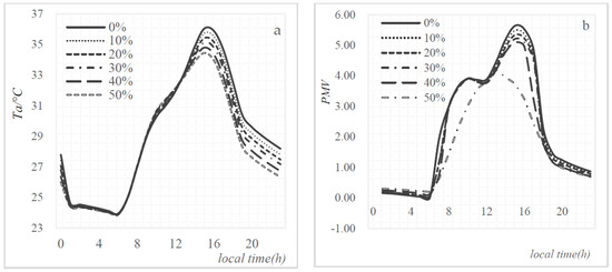 The effects of green ratio on thermal environment during 24 h (a) the effects on Ta, (b) the effects on PMV.