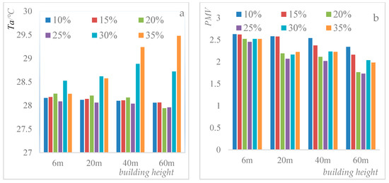 The improved effects of green on thermal environment in residential areas were also affected by building height and density (Figure 10, Figure 11, Figure 12 and Figure 13). If the green ratio increased from 10% to 50% for 10% building density, ATa and PMV decreased by 0.6 °C and 1.19, respectively. ATa and PMV decreased by 0.9 °C and 1.51, respectively, for 35% building density. If the green ratio increased from 10% to 50% for 6 m buildings, ATa and PMV decreased by 1.4 °C and 0.8, respectively. ATa and PMV reduced by 0.9 °C and 0.48 for 60 m building, respectively. Thus, if the same green area was added, there would be poorer improvement effect of green on thermal environment in residential areas with higher building height and less density. Building layout had minimal influence on the relationships among building height, density, green ratio and thermal environment.