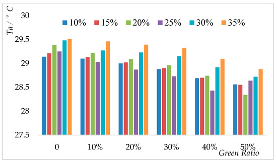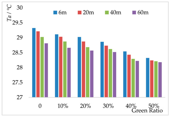 The influence of building density on the relationships between green ratio and Ta at 20 m building height.