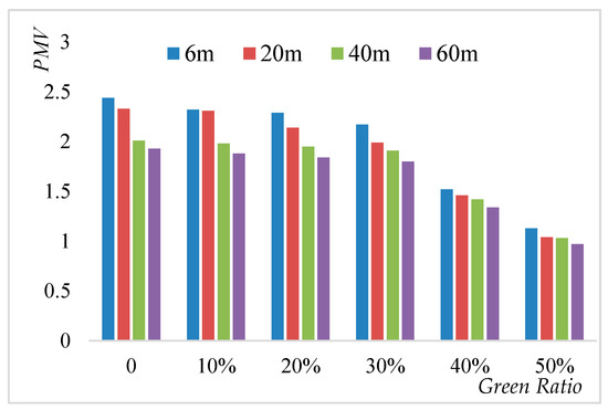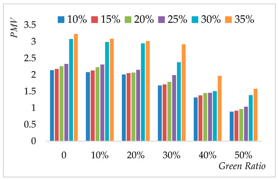 The influence of building density on the relationships between green ratio and PMV at 20 m building height.