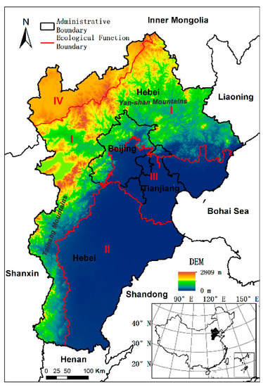 In 2015, the outline of collaborative development of Beijing, Tianjin and Hebei Province was released by the Chinese government to strengthen the ecosystem management in the region. Formulating effective policies that target regional characteristics is a major challenge in improving environmental performance, especially at the sub region level of the BTH area. Therefore, a clear exploration is needed to deepen the correlations among ES and the spatiotemporal changes over time in different physical–geographical regions [,].