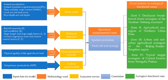 In this study, water yield and soil retention were evaluated by InVEST model, which was a model designed to map and quantify the distribution of ES through a set of standalone but linkable models and a tool for exploring how changes in ecosystems []. According to photosynthesis equation, NPP can be convert to the amount of carbon sequestration, therefore, NPP was used to represent the carbon sequestration, the capability of vegetation to absorb carbon dioxide and was calculated by the Carnegie–Ames–Stanford approach []. Grain production service was calculated by the gradation on agricultural land quality (GALQ) model, which is derived from the Agricultural Land Classification and Gradation Project by the Ministry of Land and Resources of China. Soil retention, carbon sequestration and grain productive capacity are presented at pixel scale, whereas water yield is shown at sub-watershed scale. To facilitate comparison, we indicated the values of soil retention, carbon sequestration and grain productive capacity at sub-watershed scales. Spearman nonparametric tests were performed to check for the correlations among the ES above to illustrate the regional heterogeneity in the four ecological–functional zones. The main workflow fluxes are presented in Figure 2.