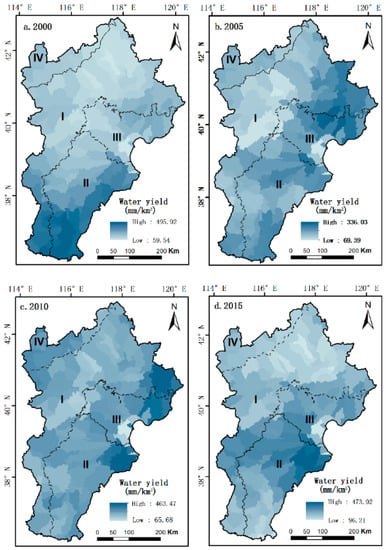 Water yield in (a) 2000, (b) 2005, (c) 2010 and (d) 2015.