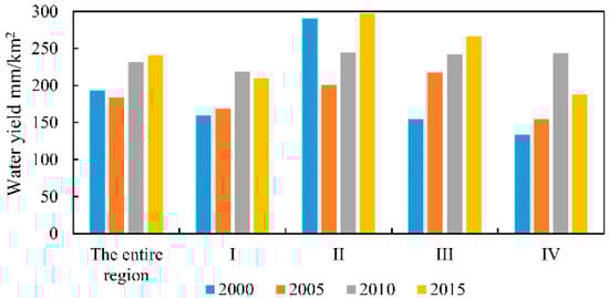 The annual average water yield had a remarkable increase from 193.41 mm/km2 in 2000 to 240.35 mm/km2 in 2015 (Figure 4). The water yield in Zone II was higher than that in other regions in all years except 2005; that in Zone IV was lower than other regions in all years except 2010.
